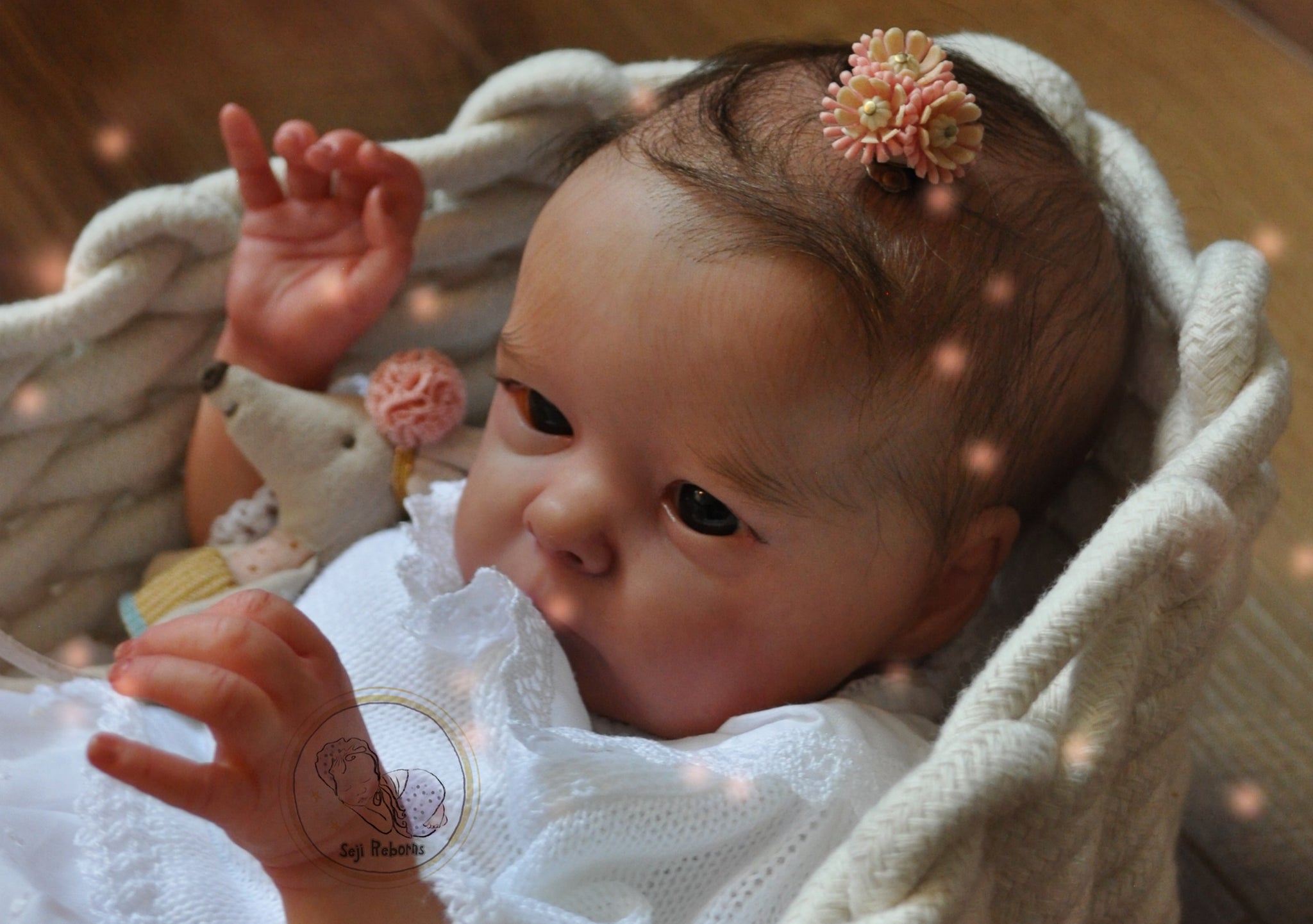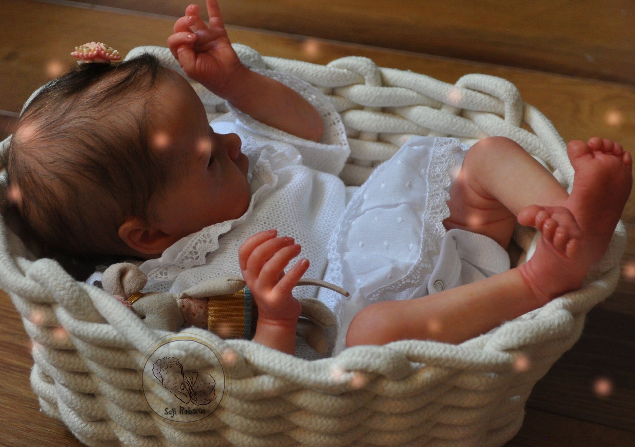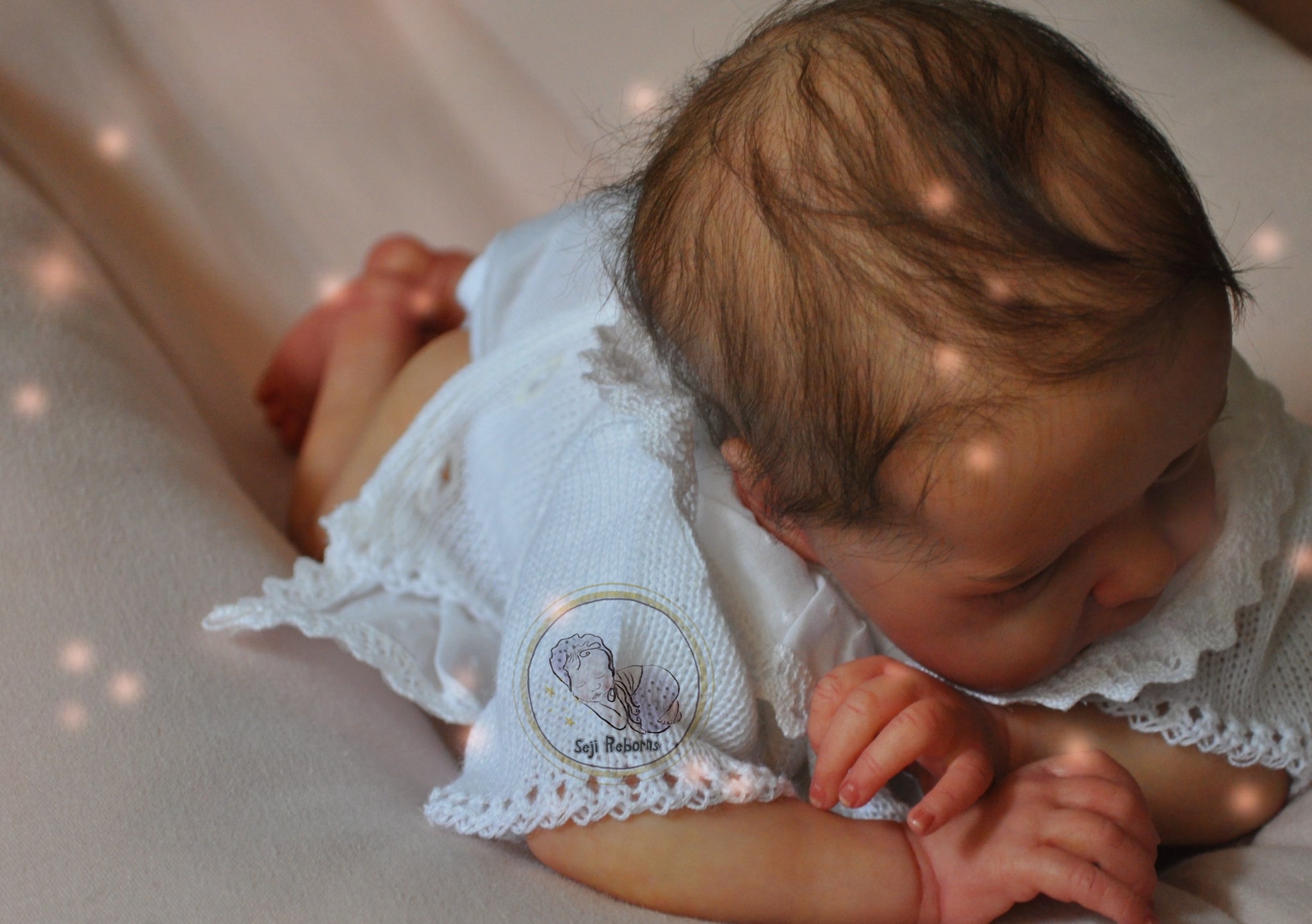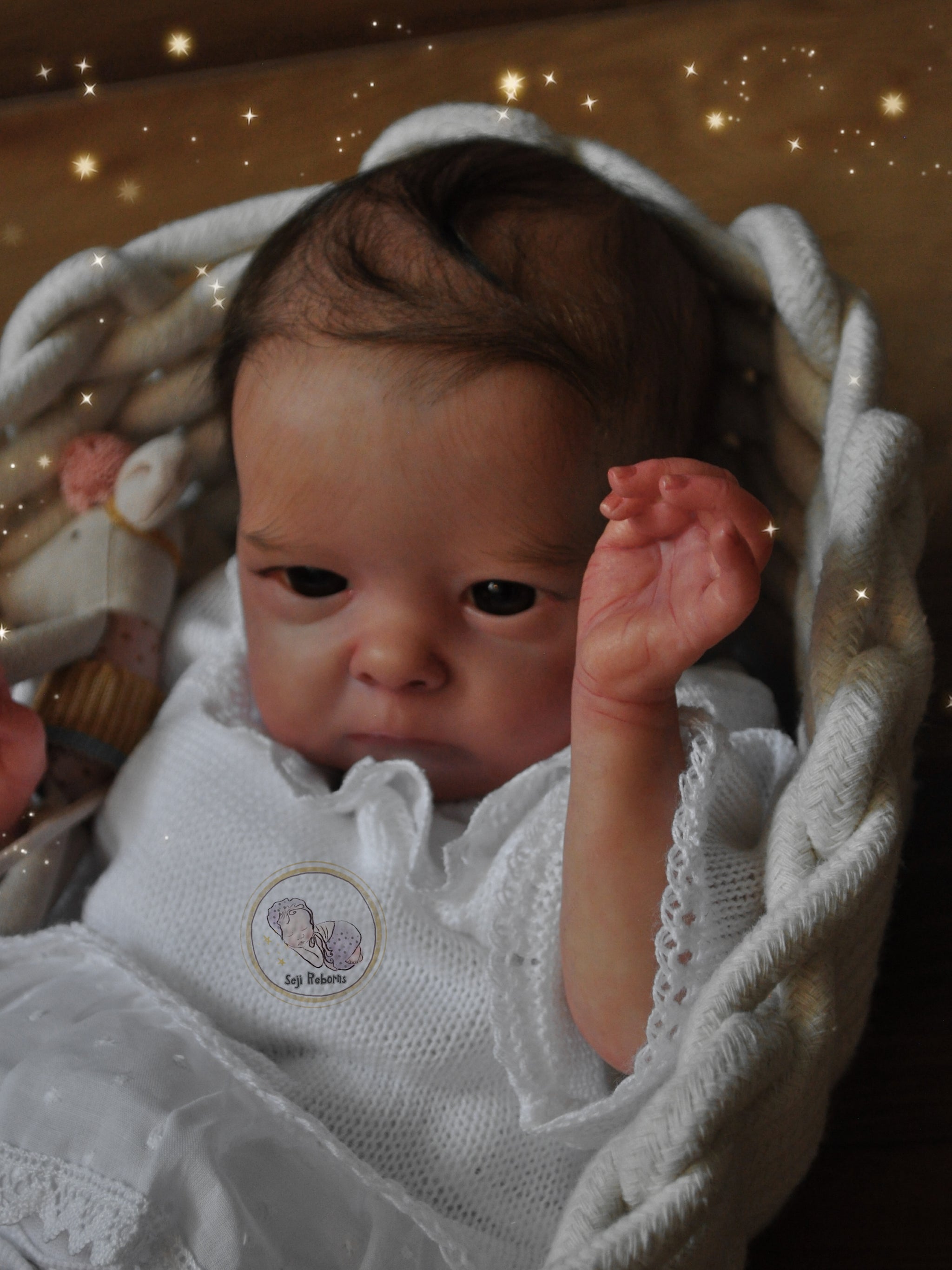 The baby is artistically unique from any other baby comes with rooted hair and also with graduation of color values from premium quality mohair which gives a highly realistic feel. The hair is soft and can be styled. Furthermore he was painted with layers and layers of fine work with Genesis paints.